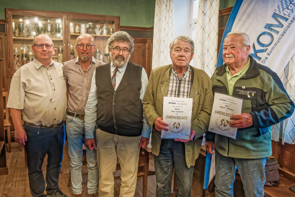 Am 10. September 2025 traff man sich beim Alten Wirt in Riedering bei Rosenheim. Hier konnte der (v.l.nr.) Vorsitzende der DPVKOM Bayern, Daniel Hoche gemeinsam mit seinem Stellvertreter Stefan Reindl und dem Ortsvorsitzenden Alois Eder die zwei anwesenden Jubilare Alois Bachhuber und Hubert Attlfellner für je 50 Jahre Mitgliedschaft auszeichnen.